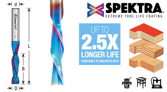 Spektra 46202-K downcut spiral router bit can be purchased individually, or in 2-packs5-packs.Also available in left-hand rotation for reverse-spinning CNC setups..Meet the Upgrade: Spektra 46202-K
