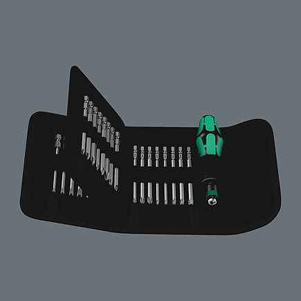 Pouch with 89-mm long bits. Includes 816 R Kraftform holder with Rapidaptor quick-release chuck and multi-component Kraftform handle for low-fatigue working. Suitable for manual and power tool operations; 33-piece.