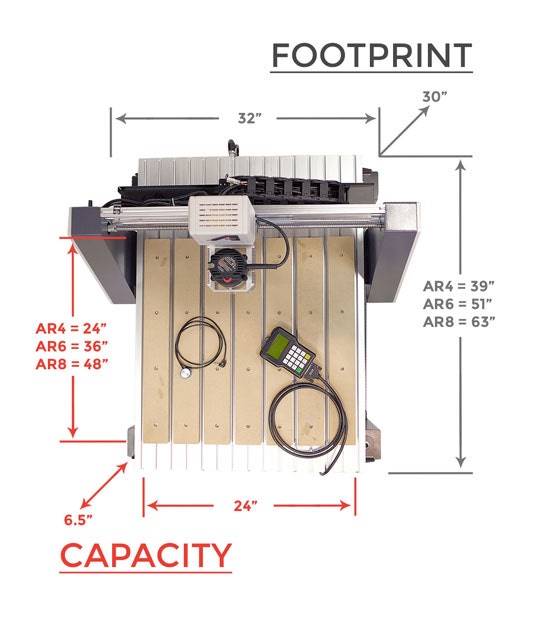 | Y axis travel | AR4=24" (610mm) AR6=36" (915mm) AR8=48" (1220mm) |