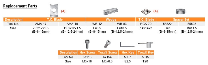 Replacement Torx® Screw, Torx® Key and Spacer Set List