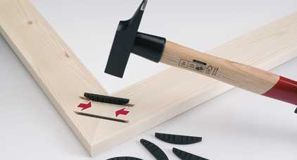 E20 is a self-clamping element and can be used with any Lamello biscuit joiner. The E20 is driven into the 4 mm groove using a hammer. During insertion, the curved ridges on each side of the connector hold in the groove and clamp the workpieces together. E20 serves as a perfect glueing aid in the workshop or on site. E20-L is suitable for surface joints such as picture frames, plinth or panel extensions. E20-H is used in the edge and serves as a plinth connector.