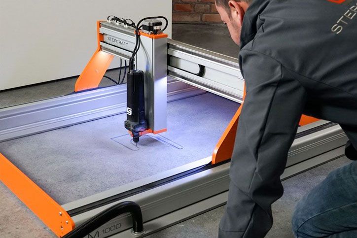 What is Freestyle Milling™? STEPCRAFT's M-Series line of CNC machines gives you the ability to mill, cut, or carve into just about any surface with precision accuracy. The M-Series machines allow you to remove the machine bed completely and mill directly into the material beneath the CNC. This can be large sheet material, directly on flooring, existing furniture, and even on a wall. When you use the optional Vacuum Rails with the M-Series CNC, a standard shop vac will provide more than enough holding force to keep the machine held securely in place while the job is performed. Imagine the possibilities of what you can create when there are no limitations!