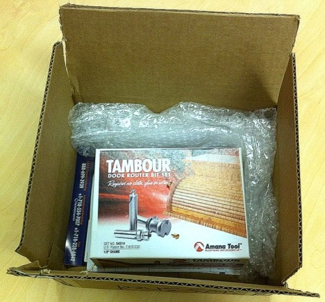 Oh, and the router bits – one to cut the outside of the slats, one to cut the groove, and a roundover bit for the handle. The final package contains the brass pull needed for the breadbox!